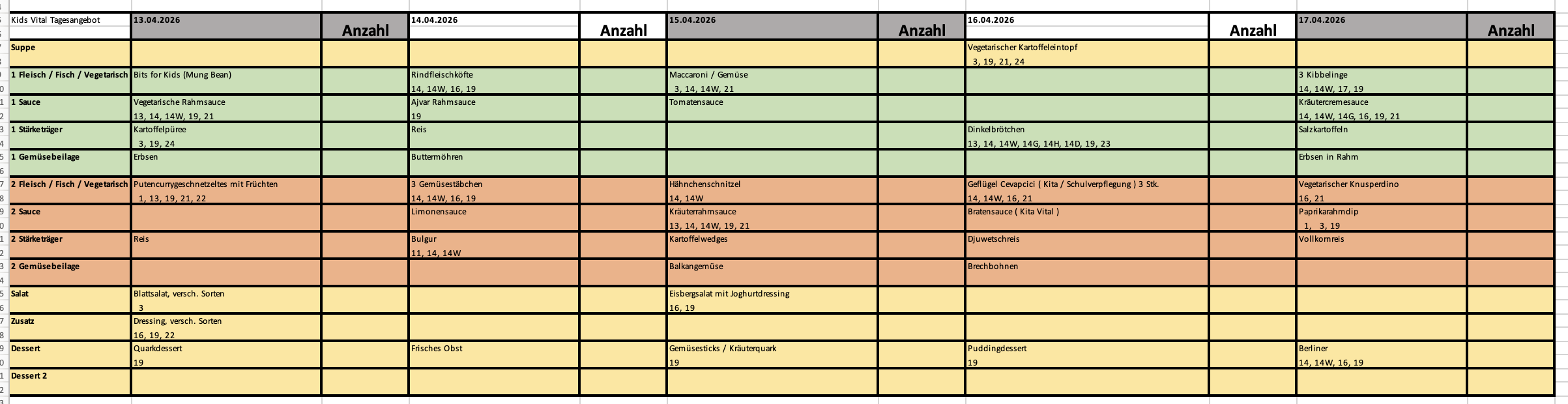 Speiseplan für die Woche vom 13.04 bis 17.04. (KW 16)